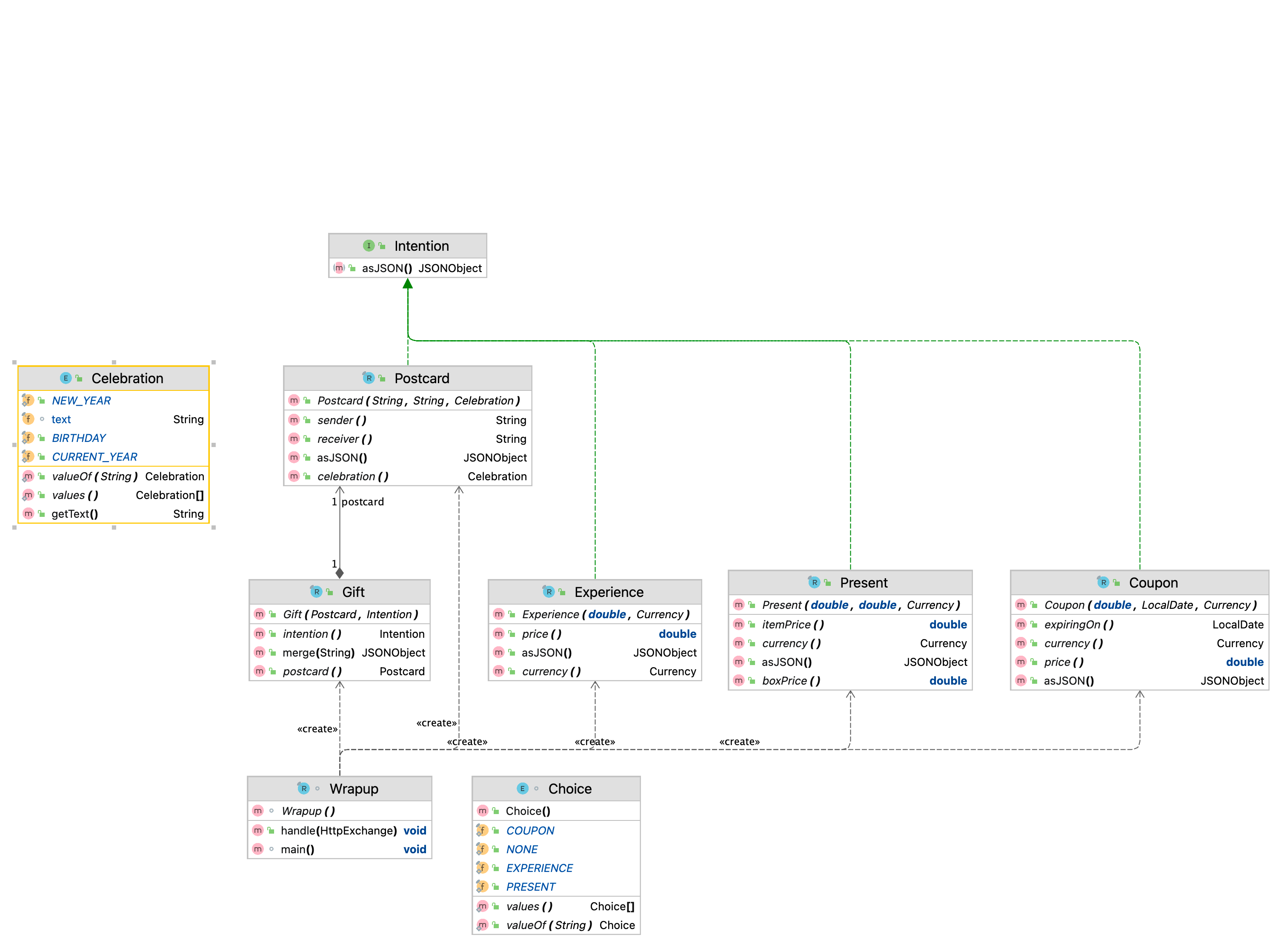 The diagram above shows a possible way to model previously described scenario. Postcard,Coupon, Experience and Present are records because they should be carriers of immutable data representing possible surprise options. They also share a common formatting process to JSON through the sealed interface Intention.